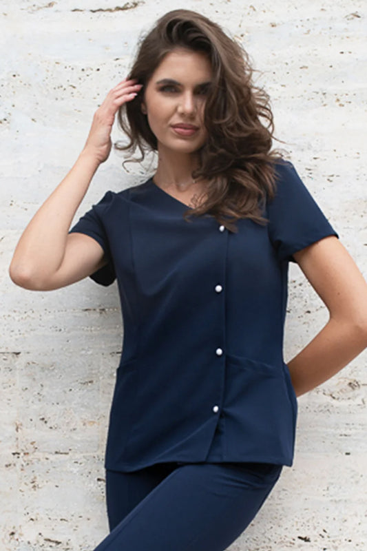 Bluza medicala eleganta PERLA mocha, din tesatura elastica, inchidere cu nasturi perla. Modelul este prevazut cu 2 buzunare laterale. Materialul din care este confectionata bluza este moale, respirabil, provine din materie prima regenerabila, avand atat elasticitate, cat si rezistenta la sifonare. tesatura elastica model...
