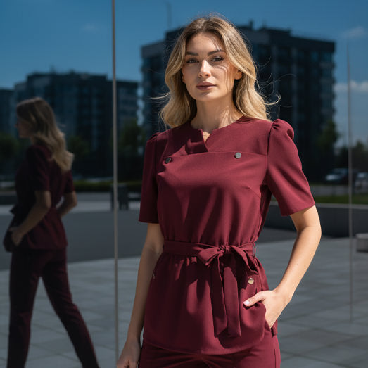 Medizinische Bluse in Mokkabraun aus elastischem Stoff, mit Peplum und 4 Taschen mit goldenen Druckknöpfen. Puffärmel und betonte Taille mit Gürtel für einen femininen und eleganten Look. Das Material der Bluse ist weich, atmungsaktiv und sowohl elastisch als auch knitterarm. elastisches Gewebe Klassische/elegante Passform...
