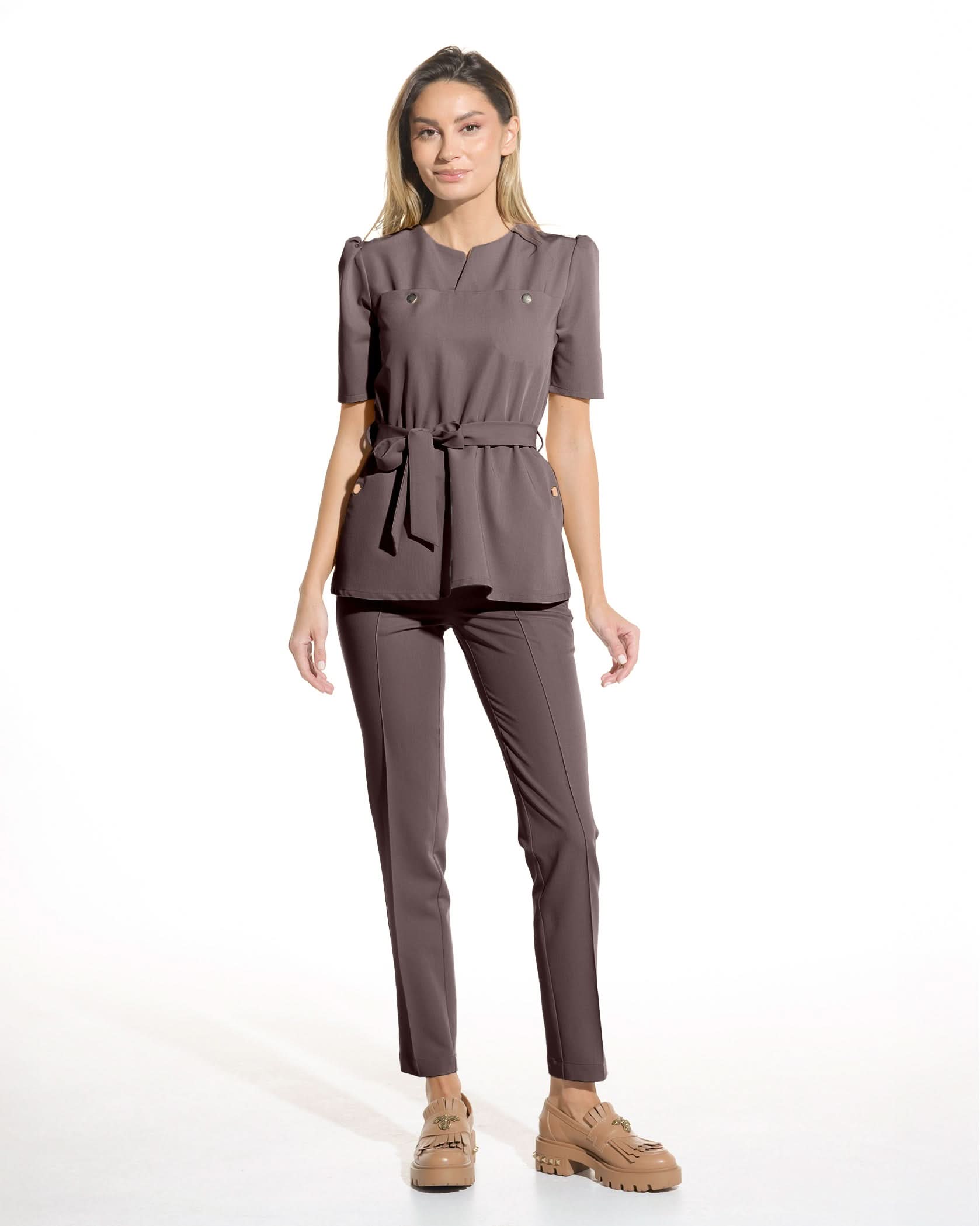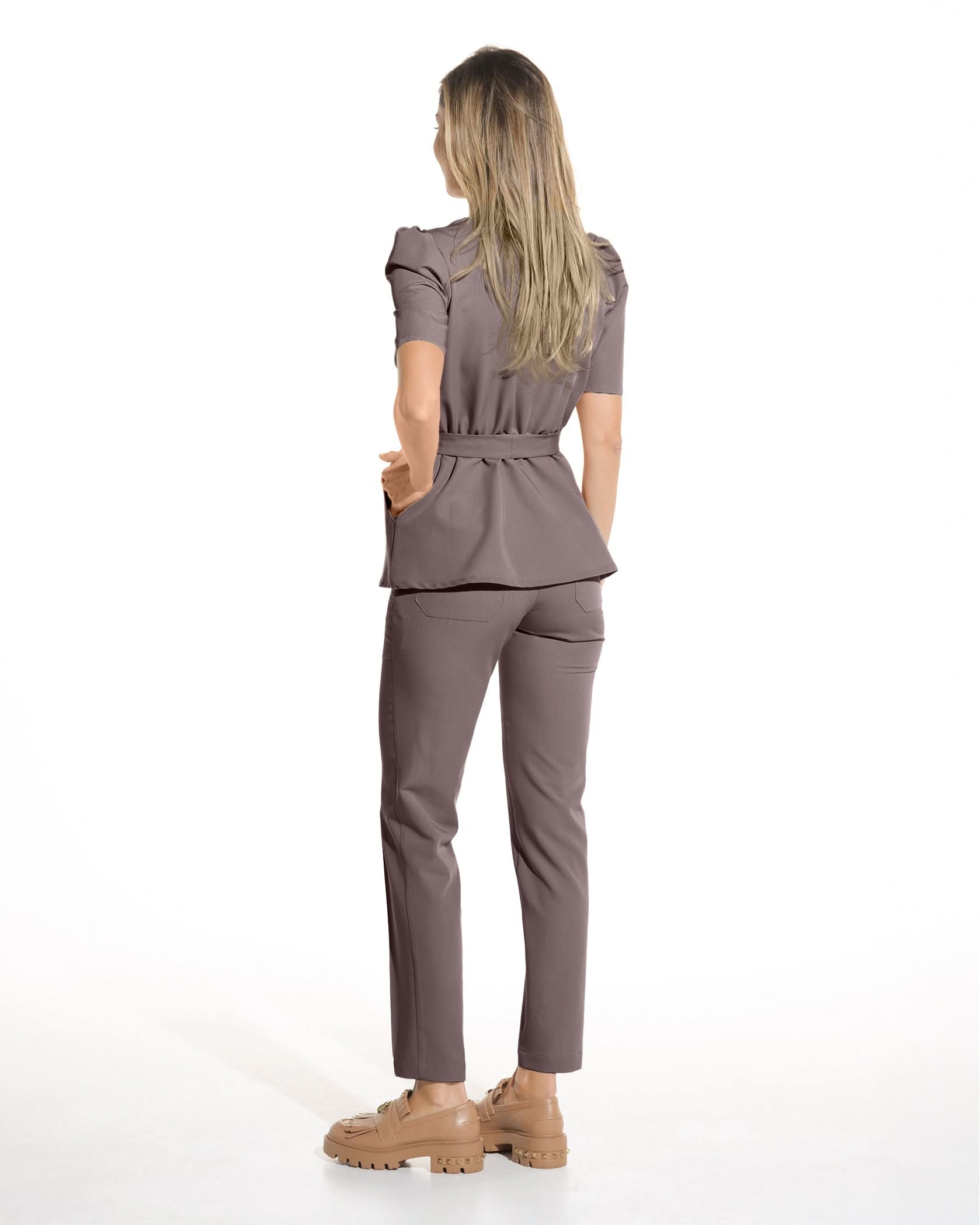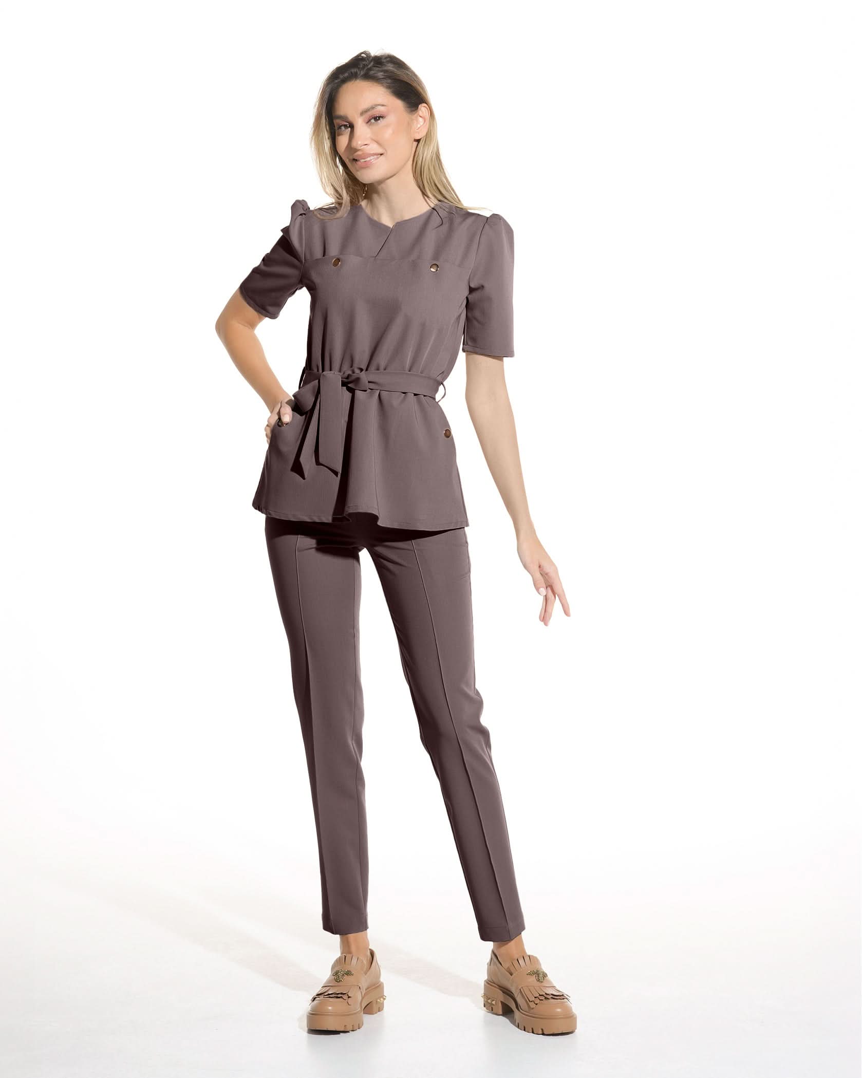 Medizinische Bluse in Mokkabraun aus elastischem Stoff, mit Peplum und 4 Taschen mit goldenen Druckknöpfen. Puffärmel und betonte Taille mit Gürtel für einen femininen und eleganten Look. Das Material der Bluse ist weich, atmungsaktiv und sowohl elastisch als auch knitterarm.