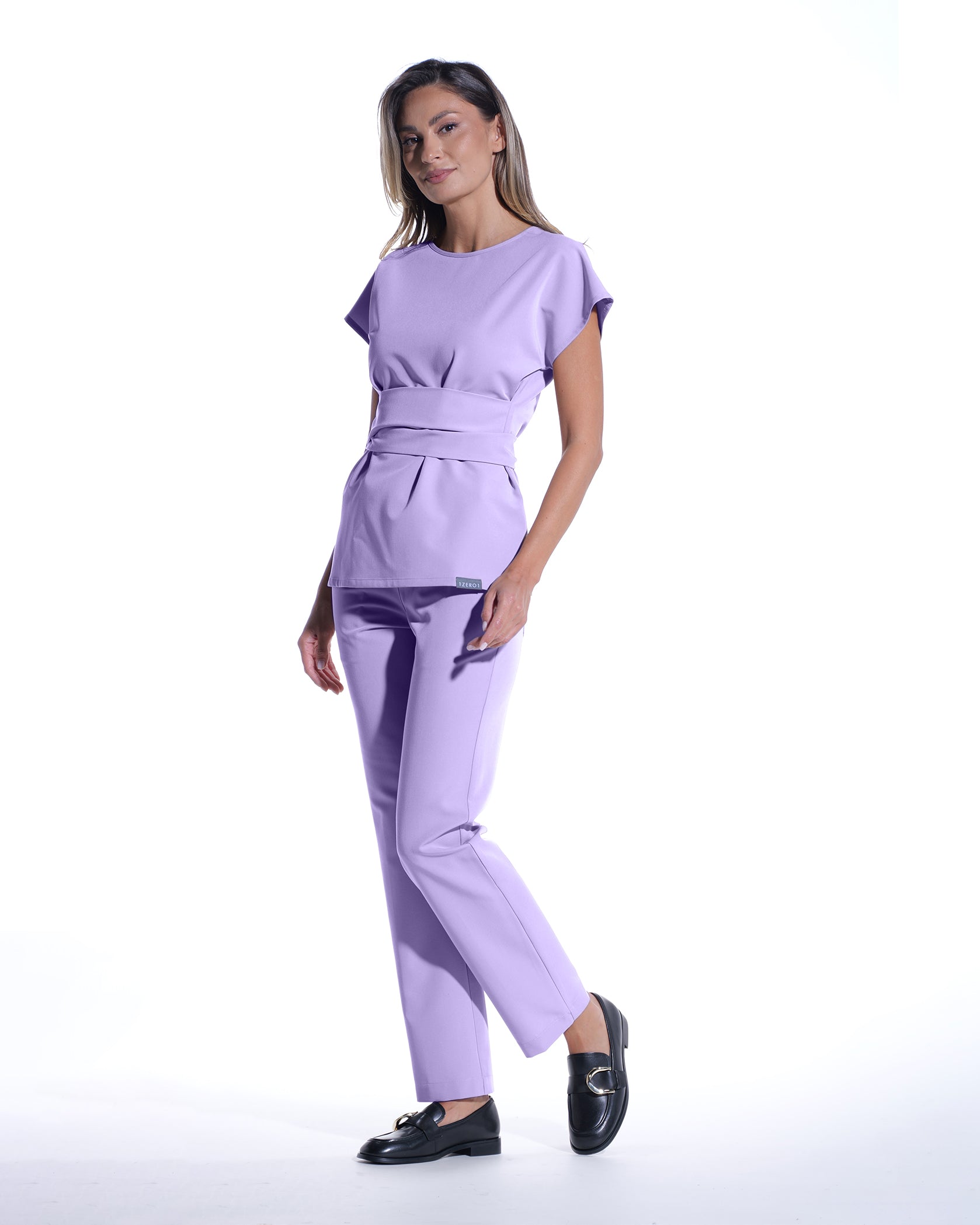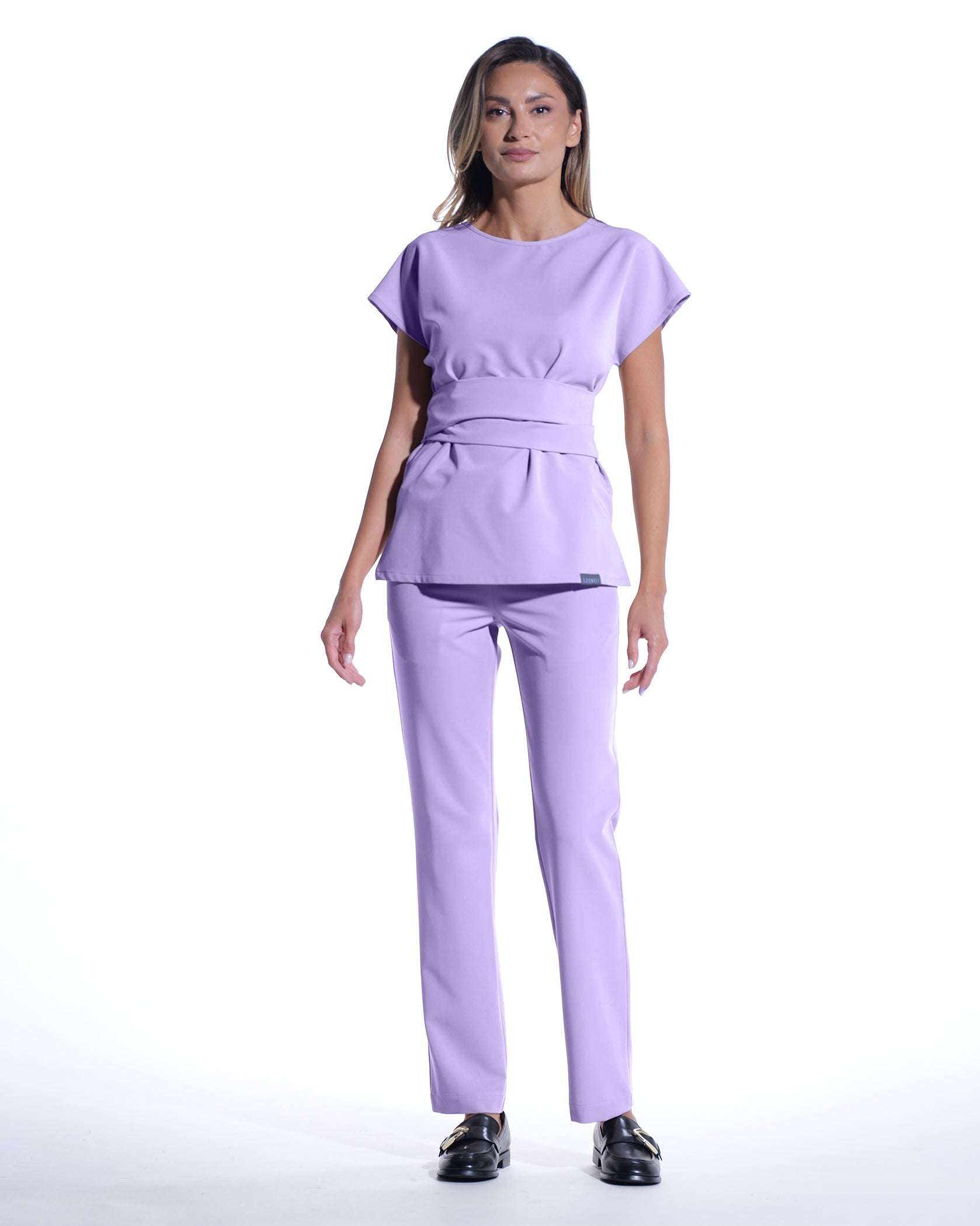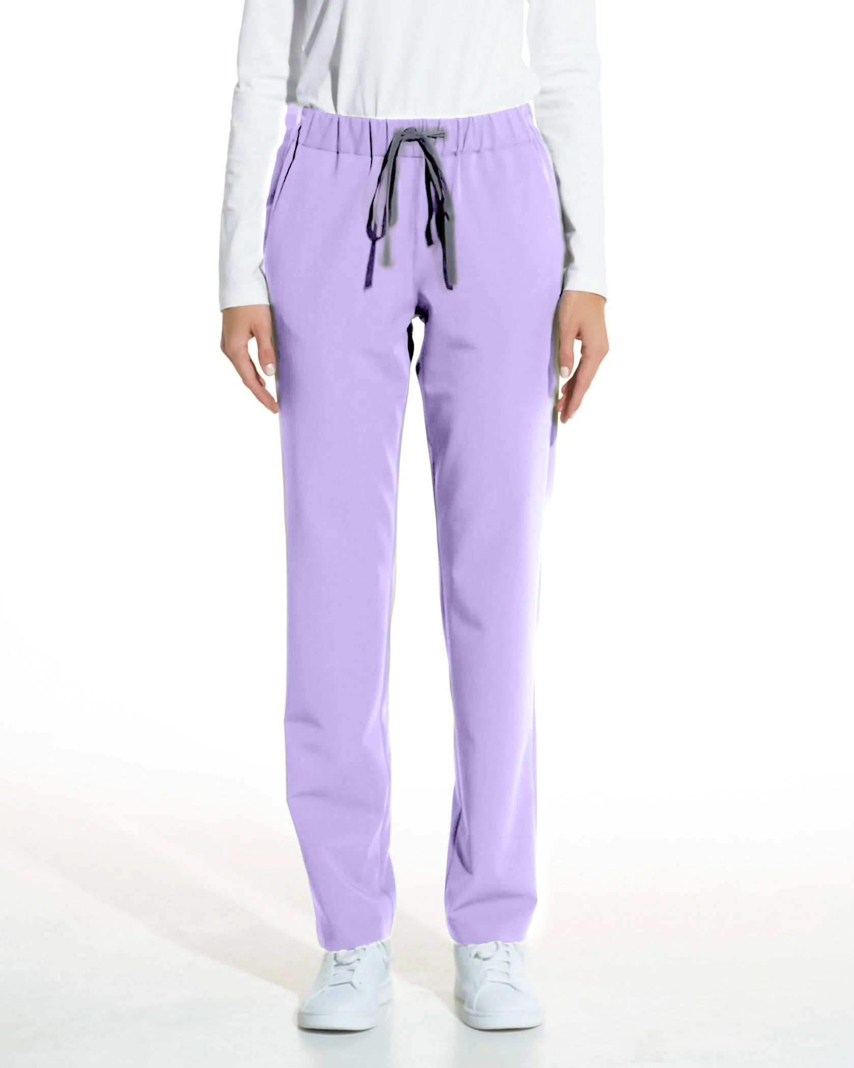 Gerade medizinische Hosen LINEA lila mit elastischem Bund und kontrastfarbener Kordel. Vier Taschen: zwei hinten und zwei seitlich.
