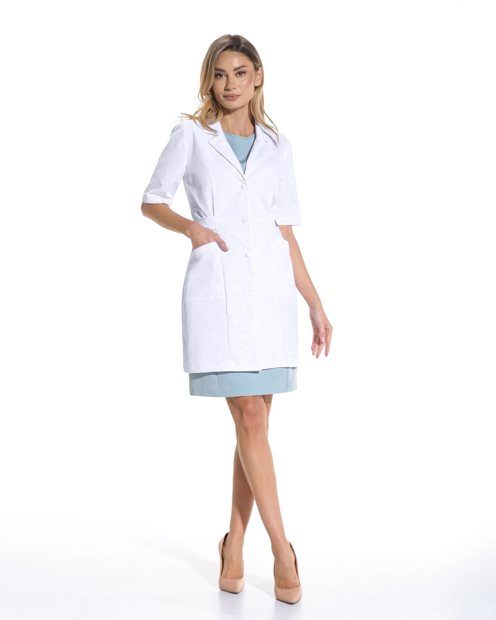 Der weiße medizinische Kittel Selene ist mehr als nur ein Kleidungsstück. Er ist ein wesentlicher Bestandteil der Arbeitskleidung, ein Zeichen von Verantwortung, Fachkenntnis und Hingabe an die Patientenbetreuung. Er ist die perfekte Verbindung von Anmut und Zweckmäßigkeit, und der ergonomische Schnitt sowie das elastische Material sorgen für angenehmes Tragen ohne Bewegungseinschränkungen, während das moderne Design Ihnen ein gepflegtes und edles Aussehen verleiht.