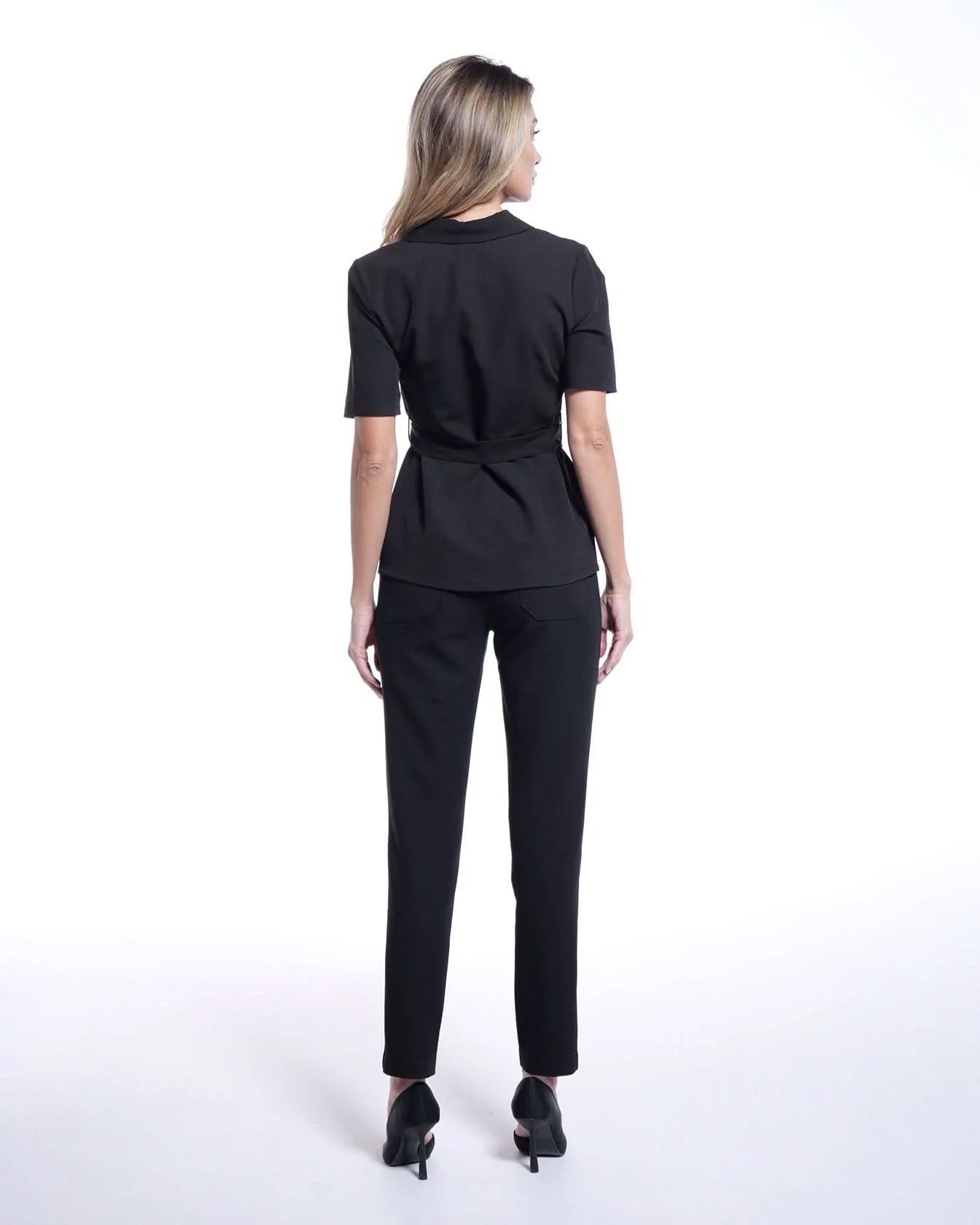 Schwarze medizinische Bluse aus elastischem Gewebe mit zwei Seitentaschen. Verschluss mit goldenen Druckknöpfen und verstellbarer Taillenbund mit Kordel für zusätzliche Eleganz. Das Material der Bluse ist weich, atmungsaktiv, stammt aus nachwachsenden Rohstoffen und ist sowohl elastisch als auch knitterarm.