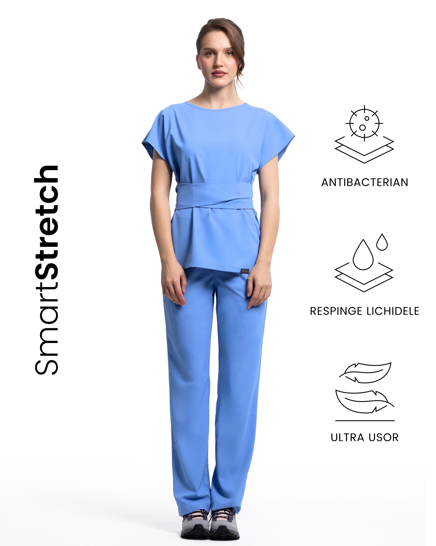 Straight medical trousers LINEA ciel with elastic waistband and contrasting drawstring. Four pockets: two at the back and two on the sides.