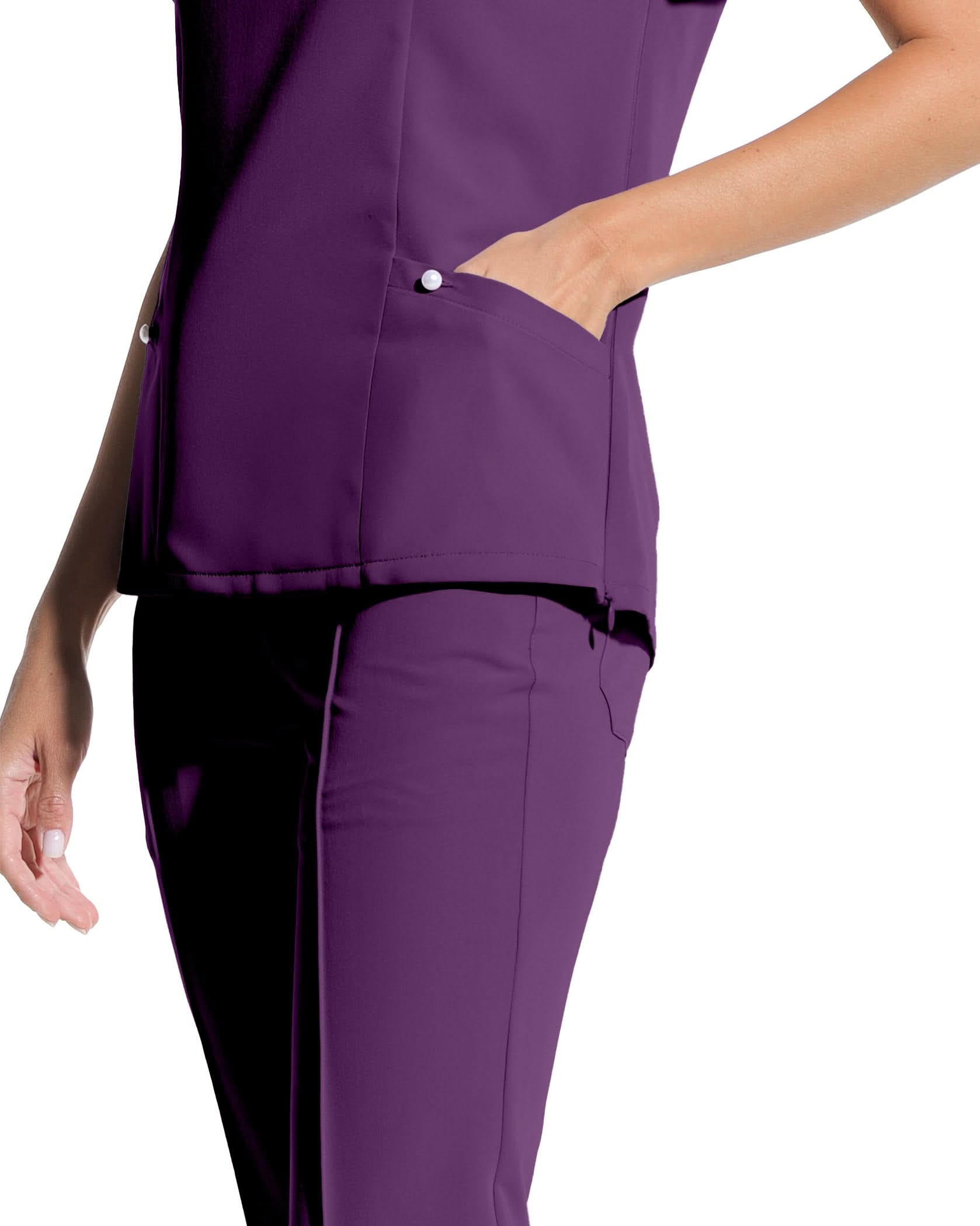 The fitted cut and tulip sleeve highlight femininity while maintaining the full comfort of a medical uniform. The hidden side zipper allows for quick dressing, and the pockets with pearl buttons add that subtle detail that transforms an ordinary outfit into one that will attract all compliments.