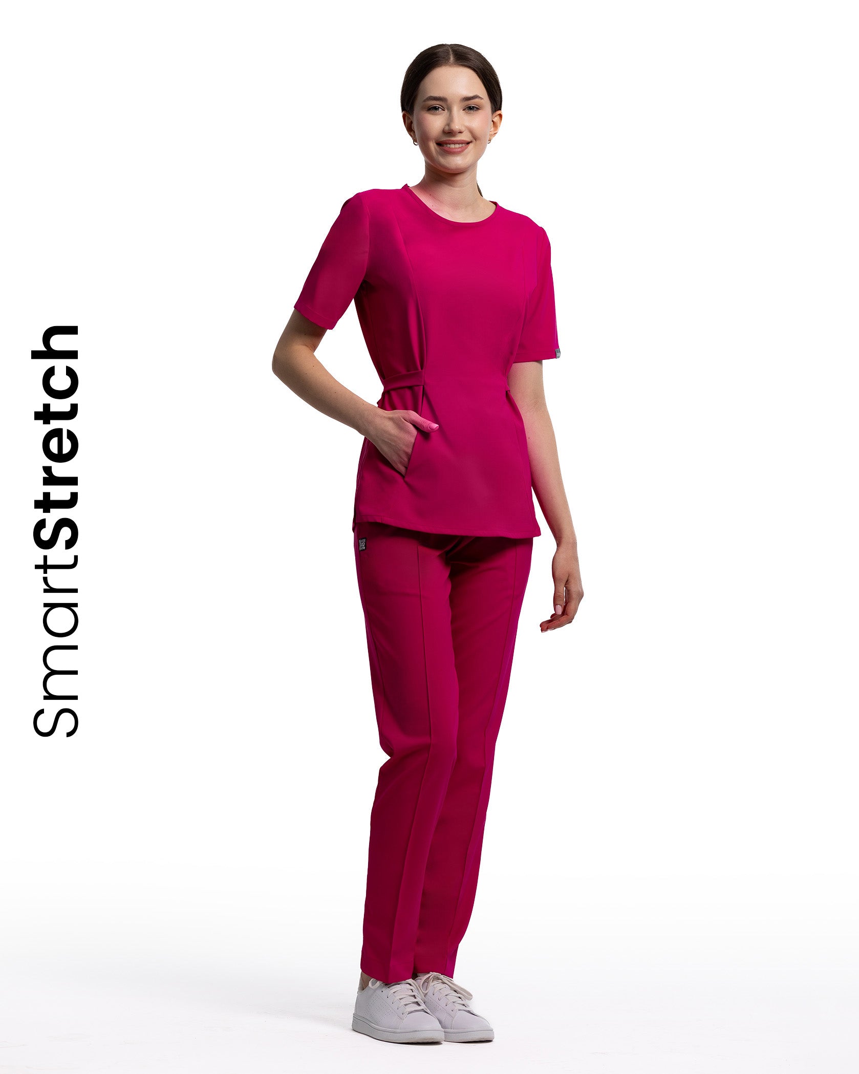 The Thalya medical blouse combines elegance and practicality, being ideal for those who seek a feminine, fitted design that is also comfortable. The handy front pocket is perfect for storing essential items, offering quick and efficient access. It is a refined choice for a professional and modern look, thanks to the waist tie that ensures a perfect fit and added comfort throughout the day. Made from a soft, stretchy, and breathable fabric, it does not retain moisture and allows freedom of movement.