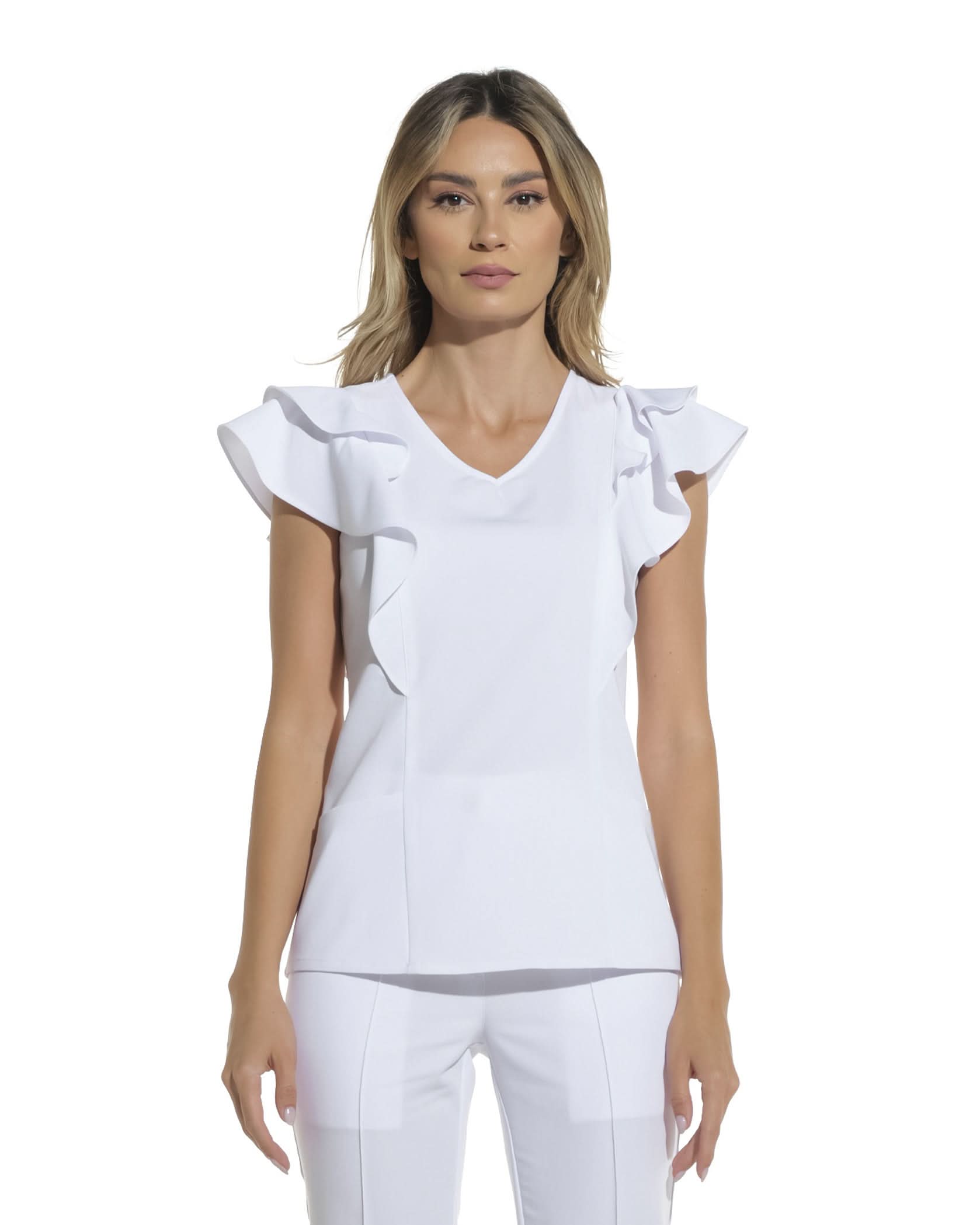 Bluza medicala eleganta AVRA alba, din tesatura elastica, prevazuta cu 2 buzunare laterale. Model prevazut cu 2 randuri de volane in zona umerilor, pentru un plus de eleganta. Materialul din care este confectionata bluza este moale, respirabil, provine din materie prima regenerabila, avand atat elasticitate, cat si rezistenta la sifonare.