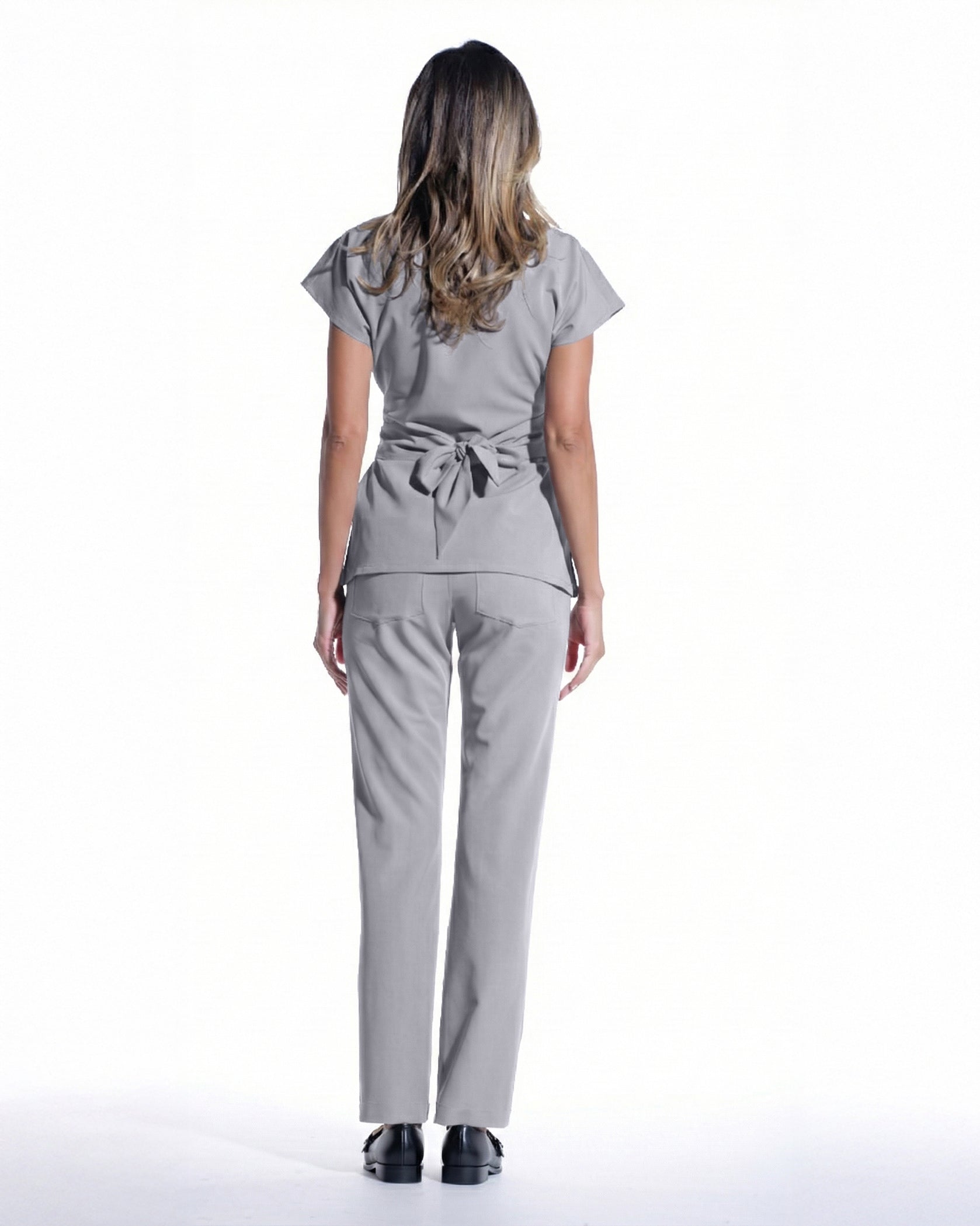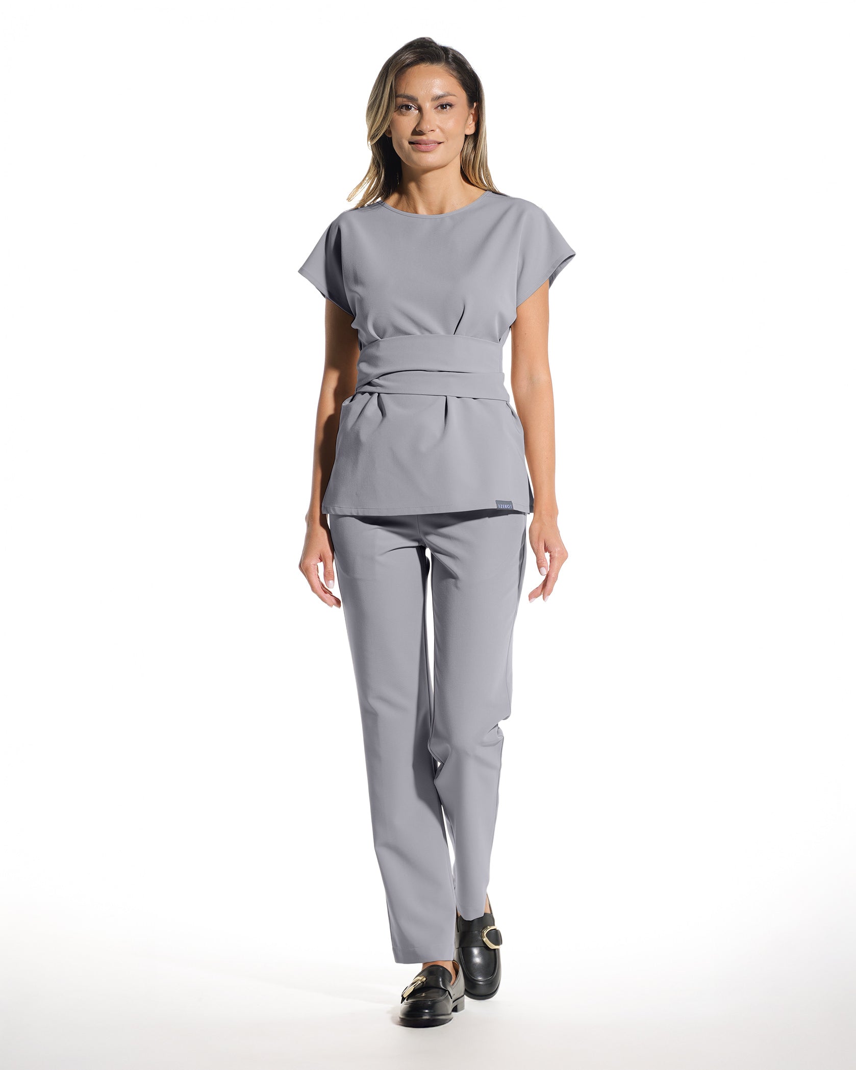 Bluza medicala gri cu talie reglabila cu cordon si buzunar frontal. Materialul din care este confectionata bluza este moale, respirabil, provine din materie prima regenerabila, avand atat elasticitate, cat si rezistenta la sifonare.
