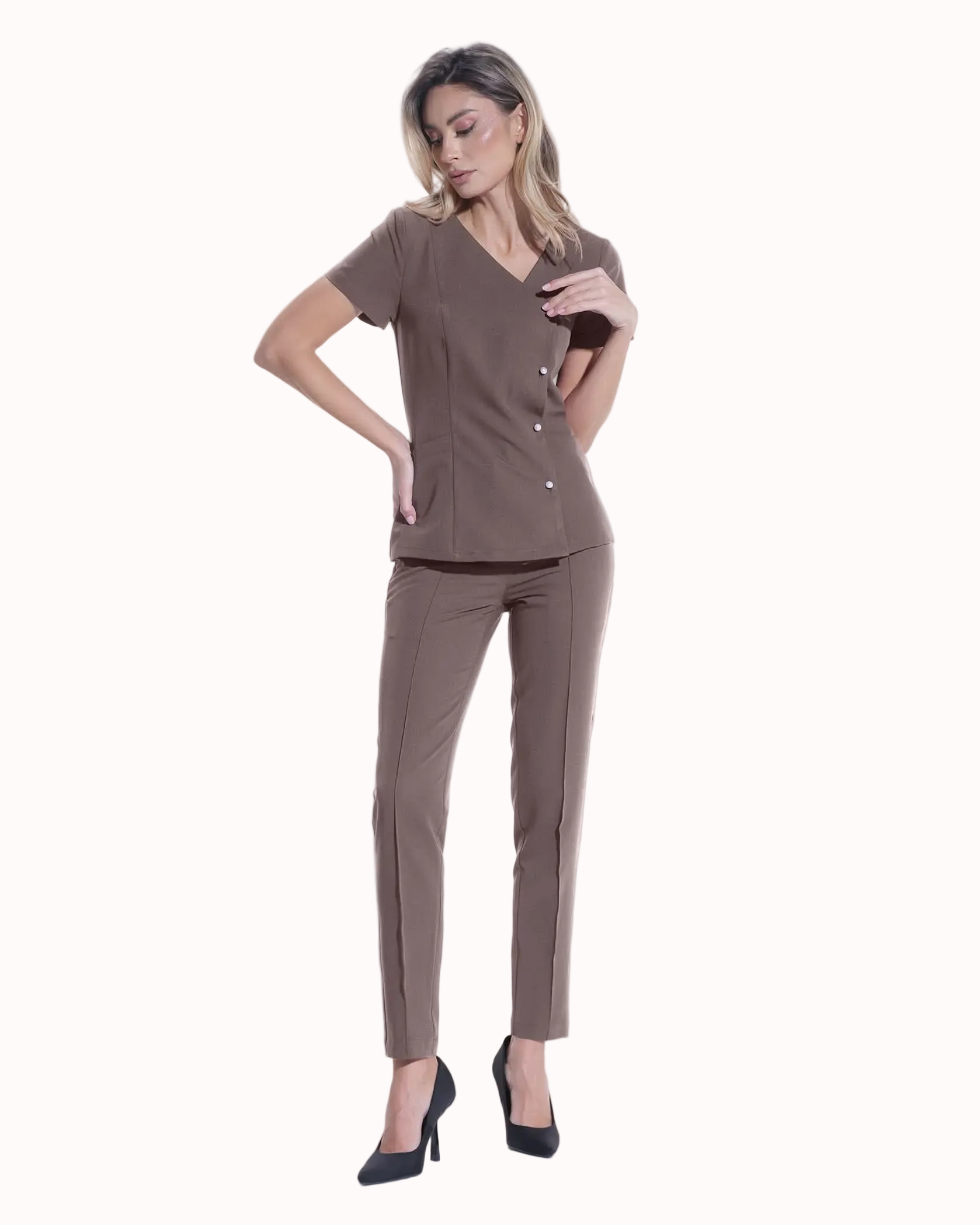 Bluza medicala eleganta PERLA mocha, din tesatura elastica, inchidere cu nasturi perla. Modelul este prevazut cu 2 buzunare laterale. Materialul din care este confectionata bluza este moale, respirabil, provine din materie prima regenerabila, avand atat elasticitate, cat si rezistenta la sifonare.