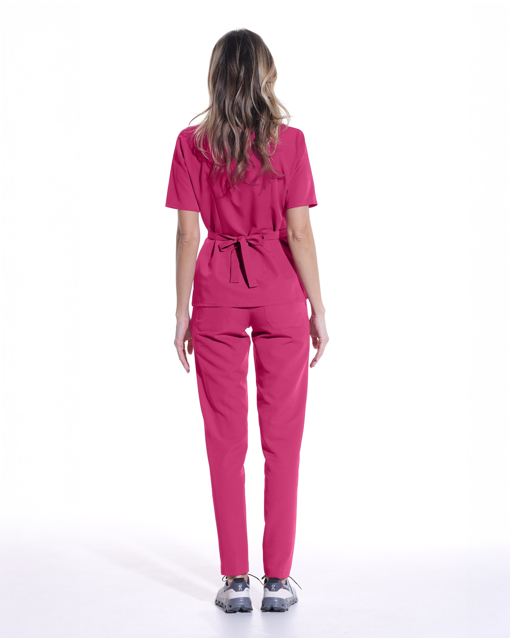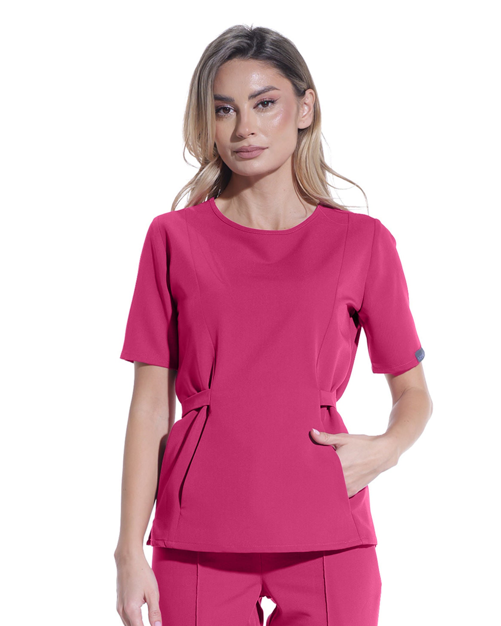 Bluza medicala magenta cu talie reglabila cu cordon si buzunar frontal. Materialul din care este confectionata bluza este moale, respirabil, provine din materie prima regenerabila, avand atat elasticitate, cat si rezistenta la sifonare.