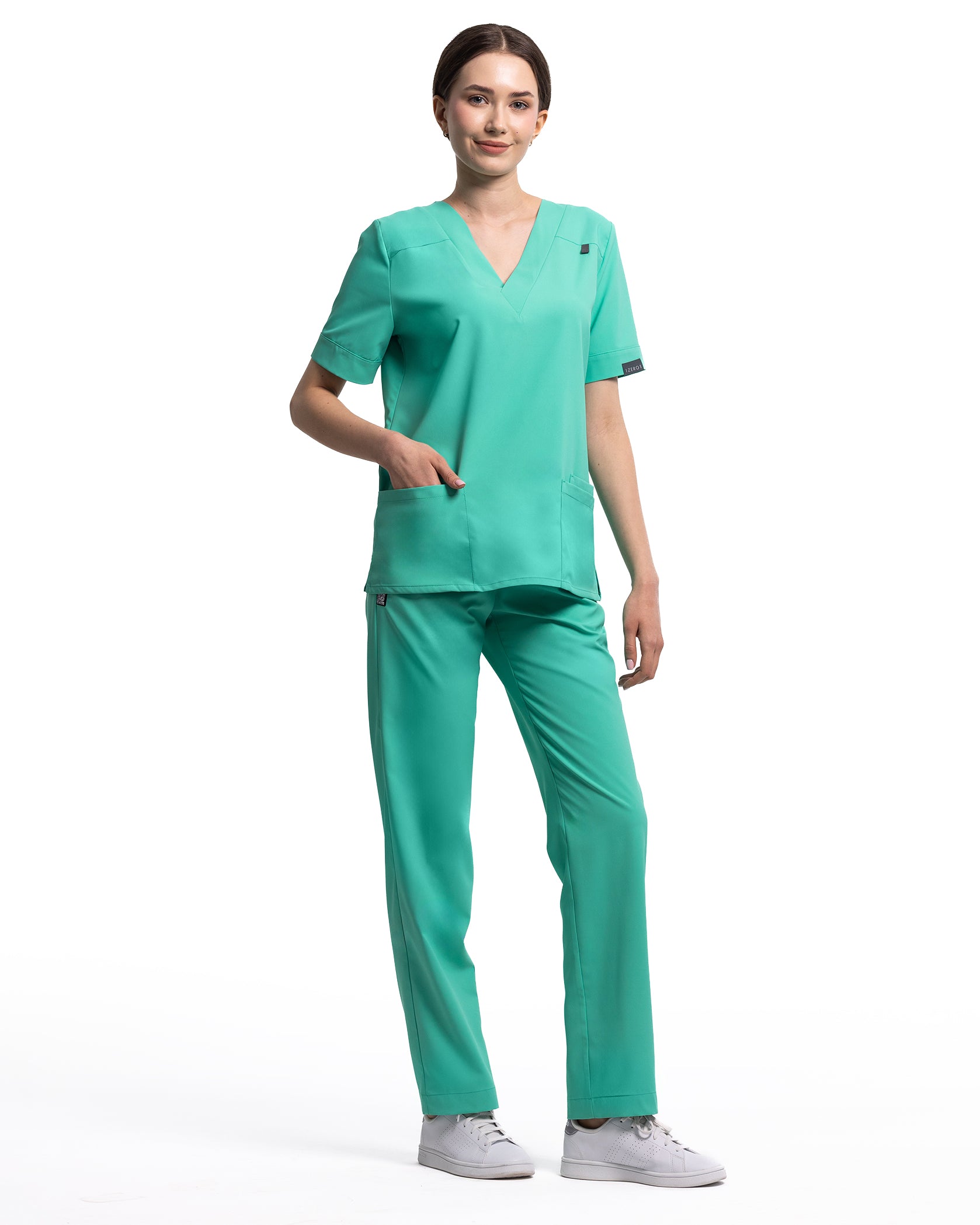 Bluza medicala dama VERSO aqua din tesatura elastica, prevazuta cu 4 buzunare dispuse frontal. Decolteu adanc in "V" si maneci cu taieturi decorative la baza umarului. Materialul din care este confectionata bluza este moale, respirabil, provine si materie prima regenerabila, avand atat elasticitate, cat si rezistenta la sifonare.