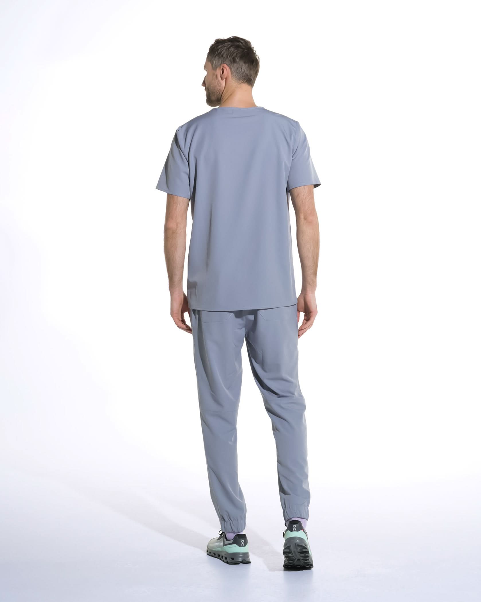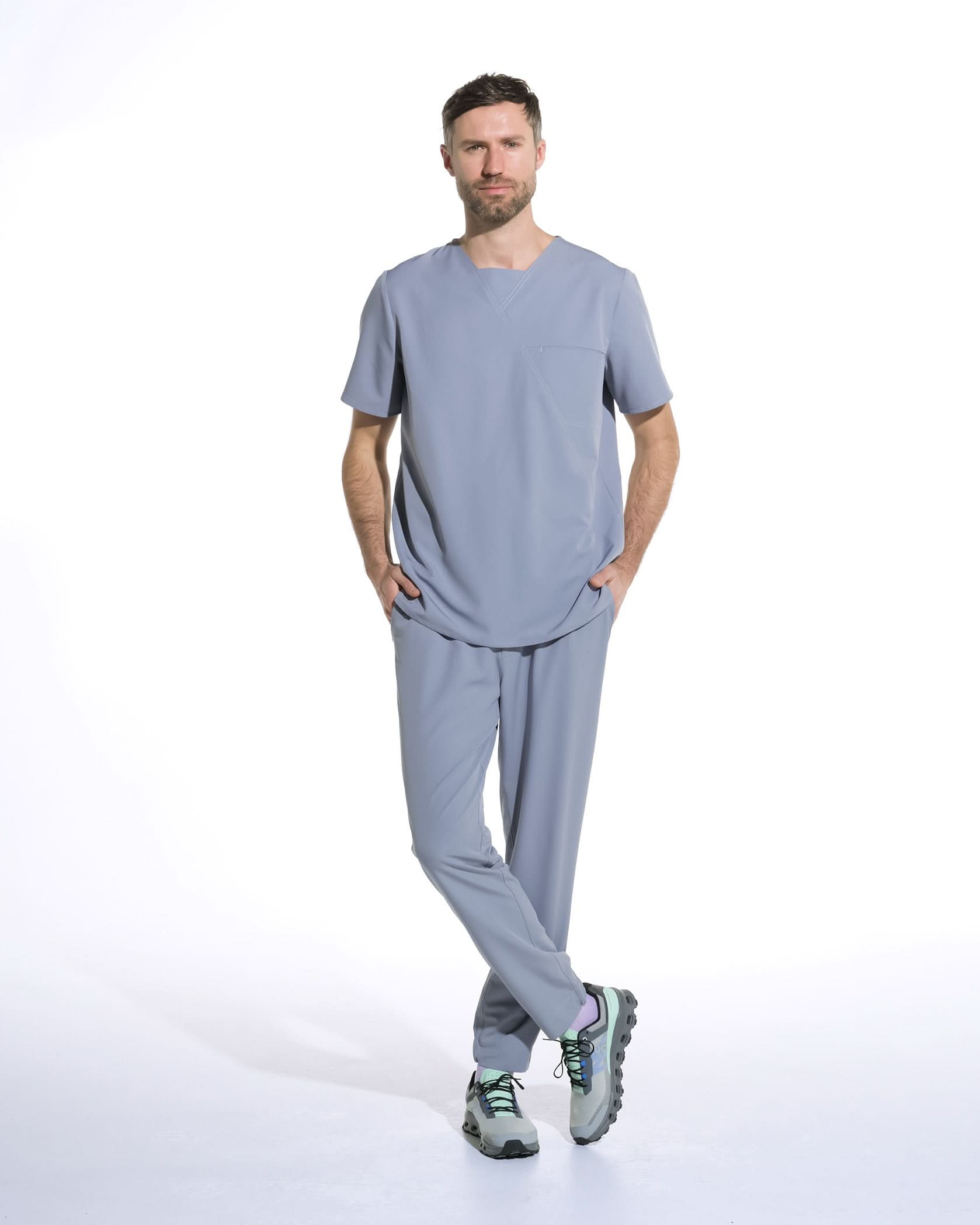 Pantaloni medicali RIZZ gri cu talie elastica si snur reglabil in contrast. Materialul din care sunt confectionati pantalonii este moale, avand atat elasticitate, cat si rezistenta la sifonare.