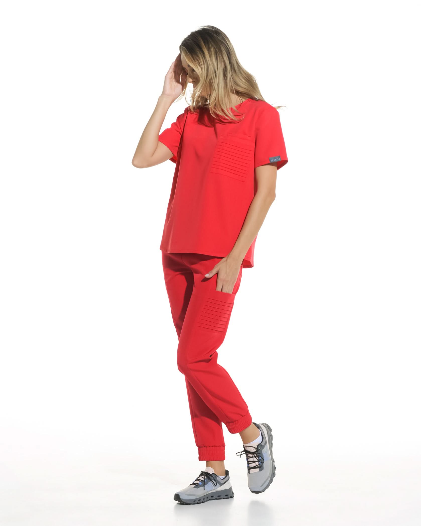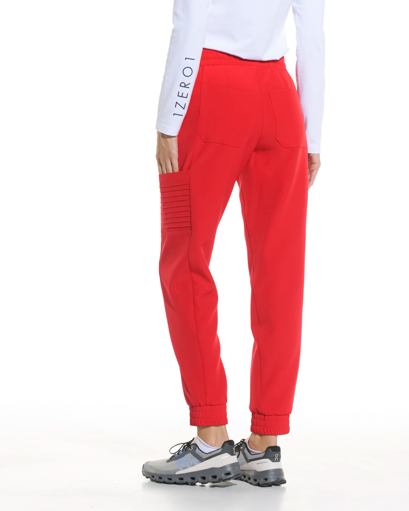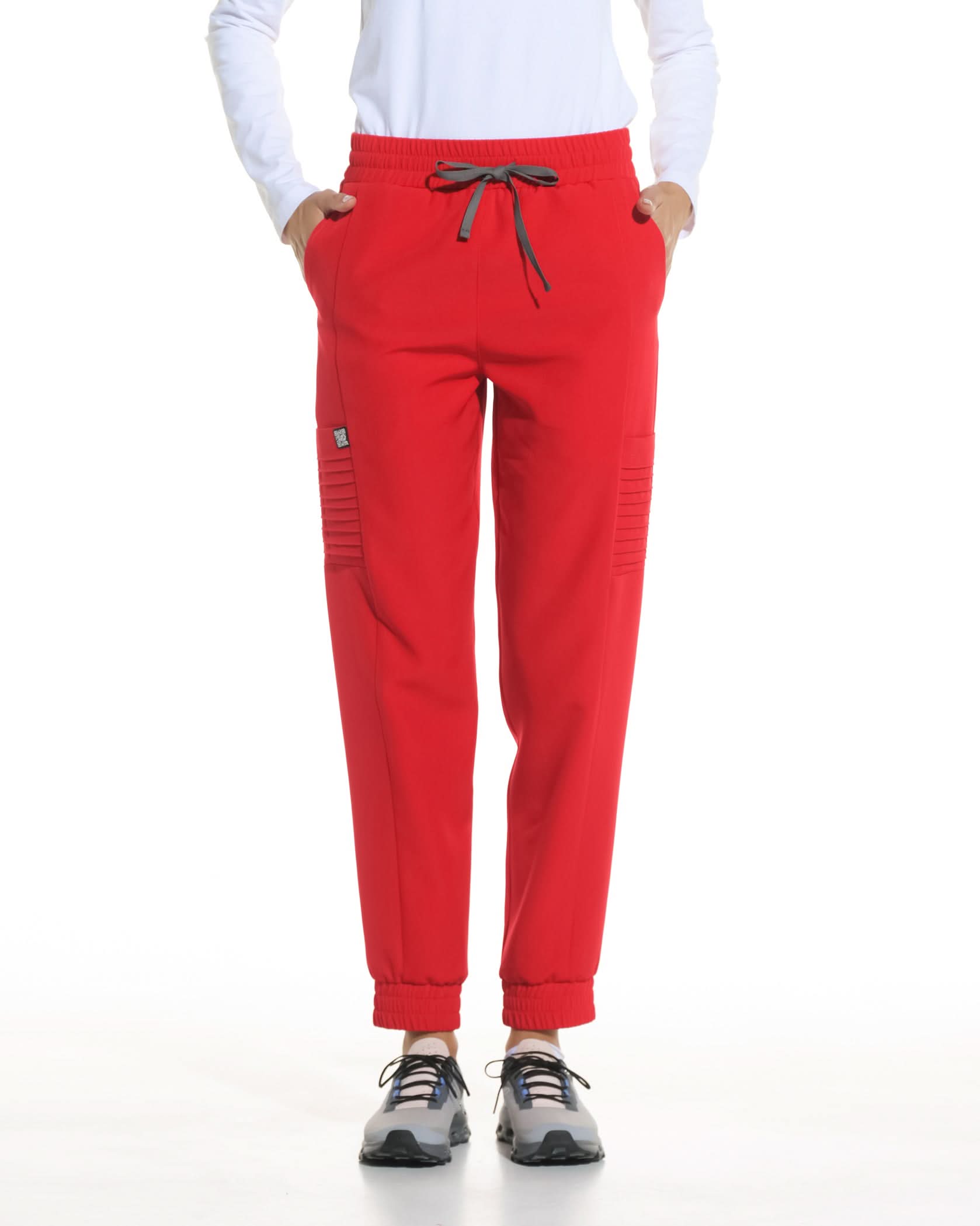 Pantaloni medicali tip jooger. Talia este prevazuta cu elastic lat de 5cm si snur in contrast pentru reglare. Elastic la baza gleznei si 6 buzunare: doua spate, doua fata in partea superioara si doua buzunare dispuse lateral pe picior. Detalii decorative: taieturi si nervuri sub buzunar. Materialul este moale, confortabil si provine si materie prima regenerabila. Tesatura este elastica.