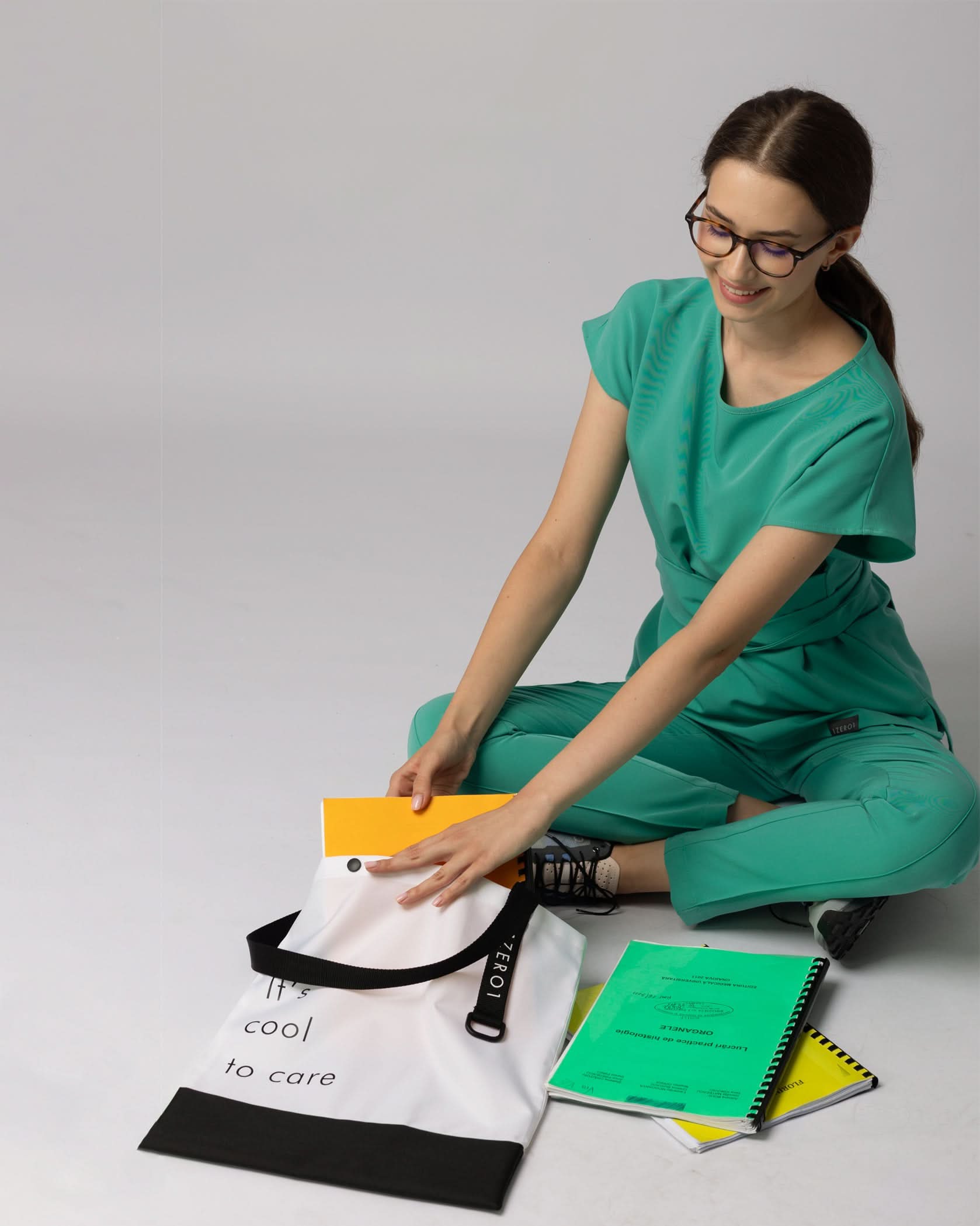 Tote bag din material impermeabil, ideal pentru a transporta uniforma, incaltamintea, cursurile sau accesoriile de care ai nevoie la facultate, spital sau cabinet. Designul modern si minimalist se potriveste perfect cu uniformele medicale premium 1ZERo1 sau poate fi integrat in tinutele de zi cu zi. Spatiul geneRos aduce un plus de confort, facilitand transportul echipamentului fara efort. Astfel, te bucuri de un accesoriu practic, dar si stylish, care completeaza perfect imaginea ta cool.